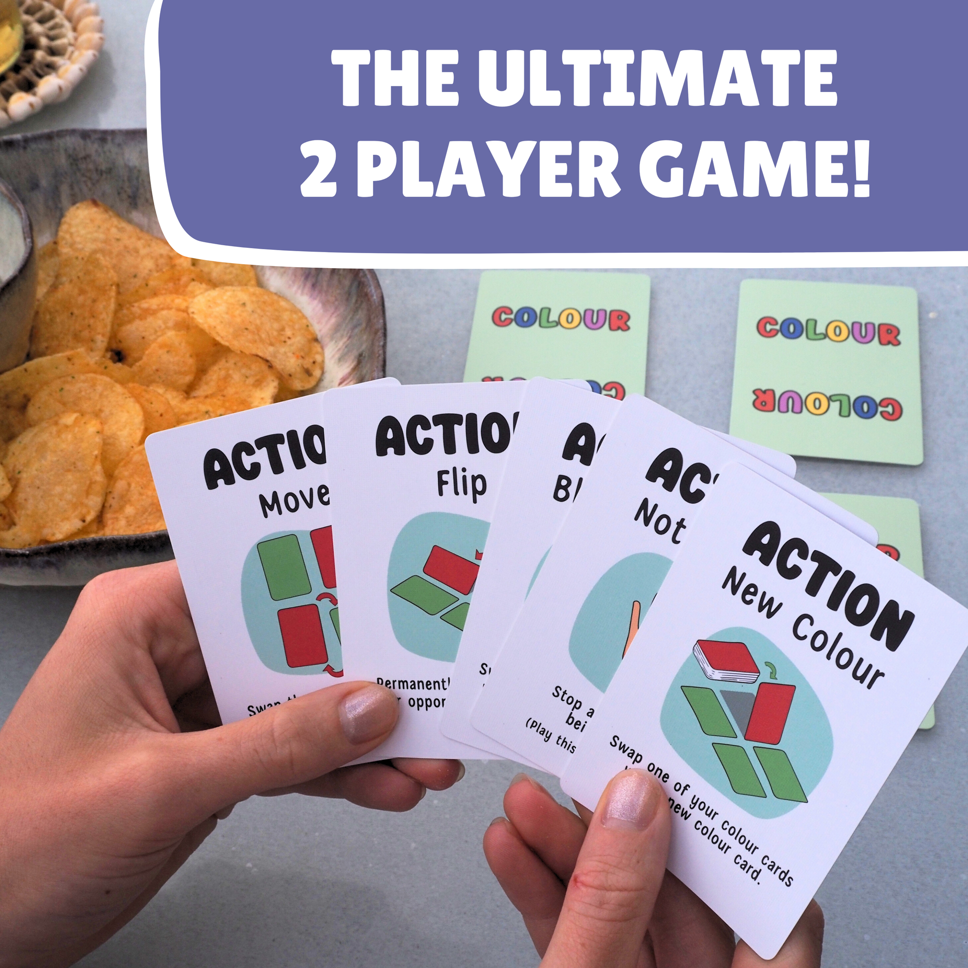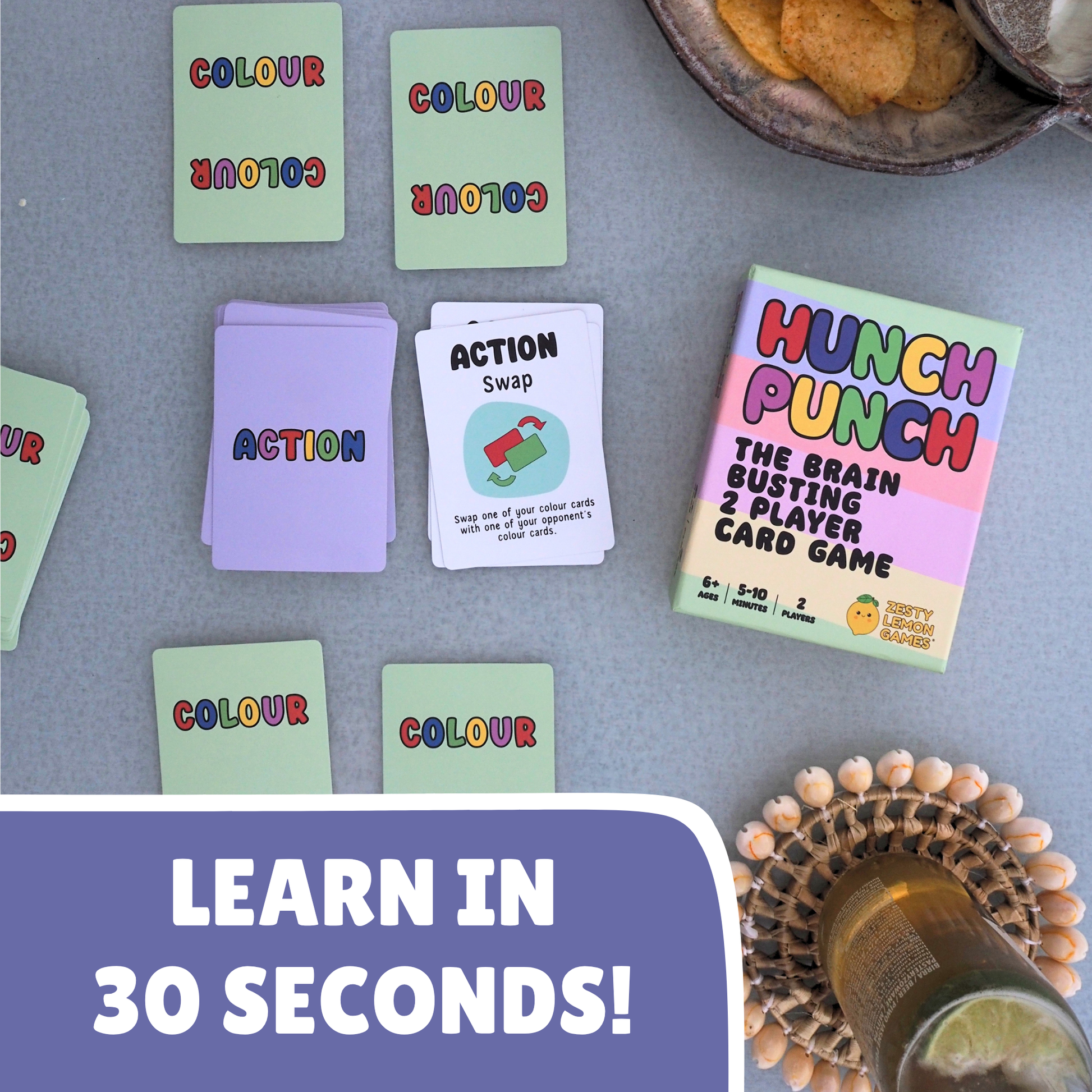 Hunch Punch is a quick two-player card game that puts your memory skills to the test. The goal? Work out your opponent’s colours in the correct order before they figure out yours. Each player starts with a set of hidden colour cards and a hand of action cards. On your turn, you get to secretly look at one of your opponent’s cards and then play an action card to gather more information or throw your opponent off track. When you think you’ve cracked the code, call “HUNCH PUNCH” at the start of your turn and make your guess. Get it right and you win but get it wrong and the victory is handed to your opponent!