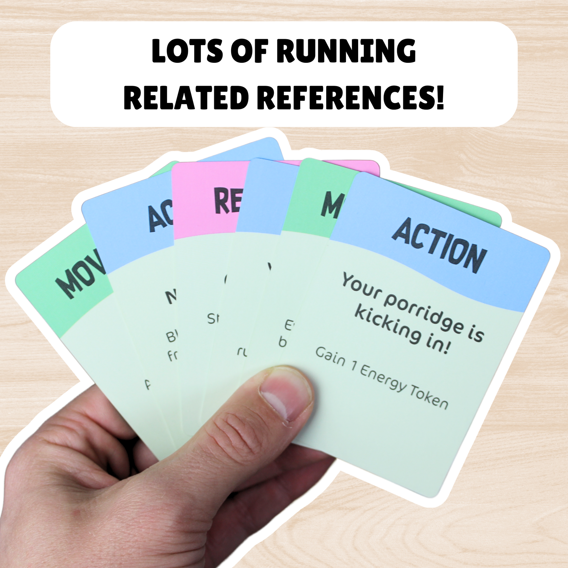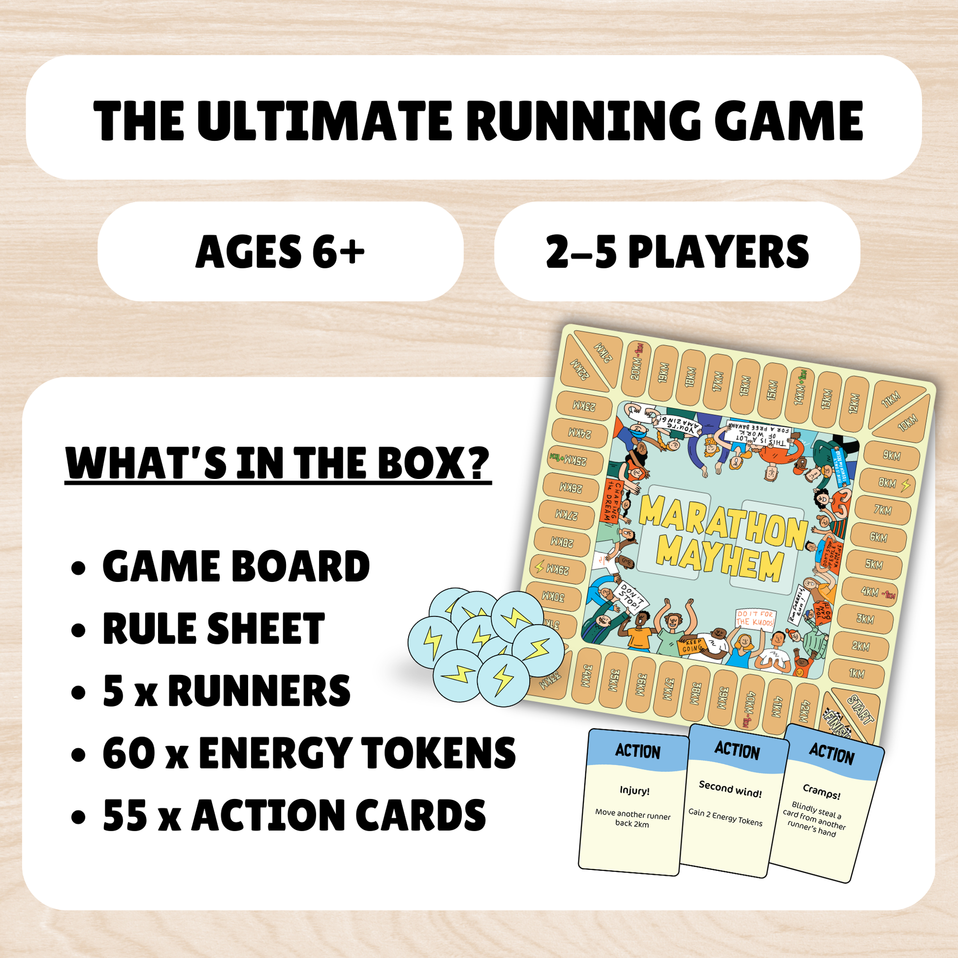 Inside a box of Marathon Mayhem is a game board, rule sheet, 60 energy tokens, 55 cards and 5 running-themed meeple.