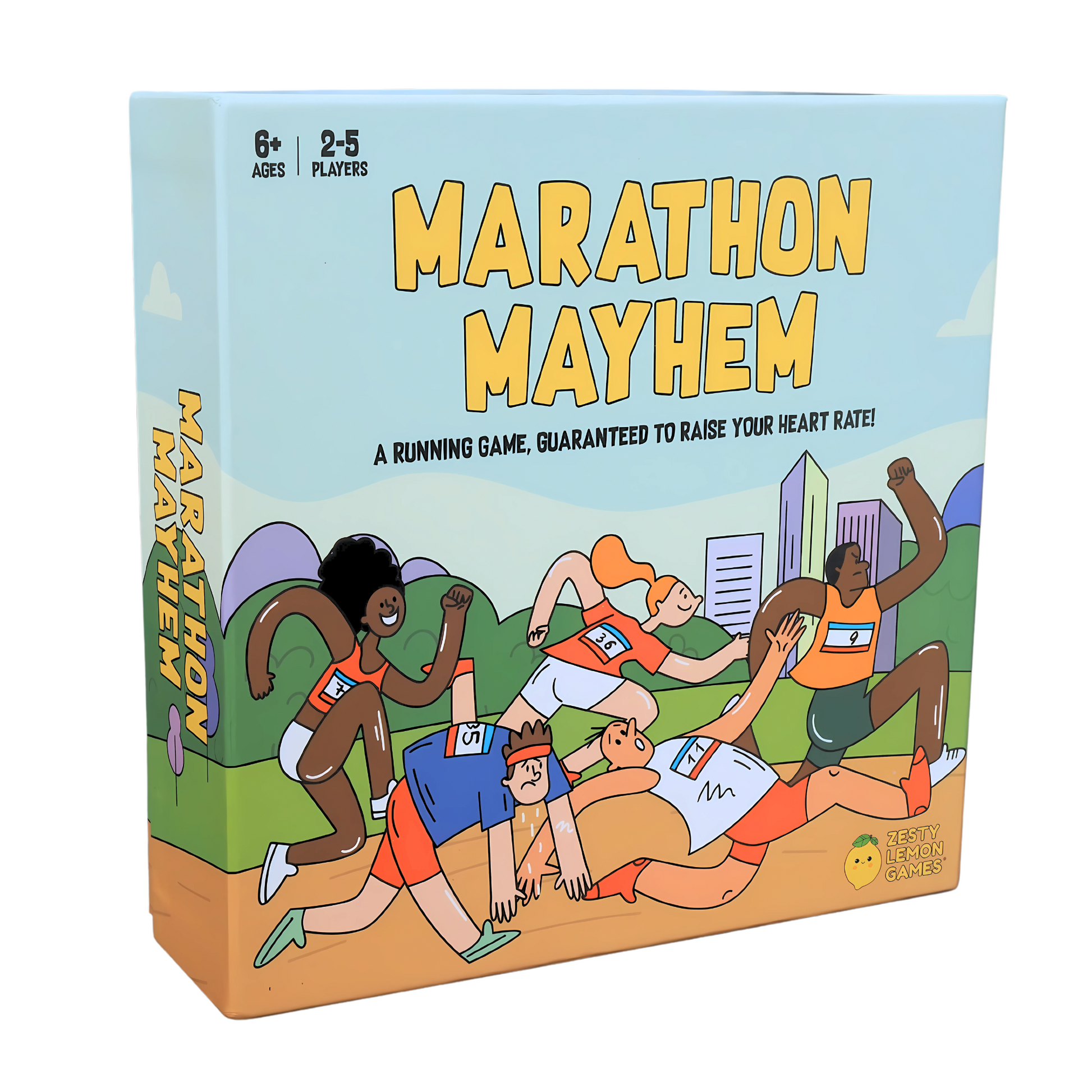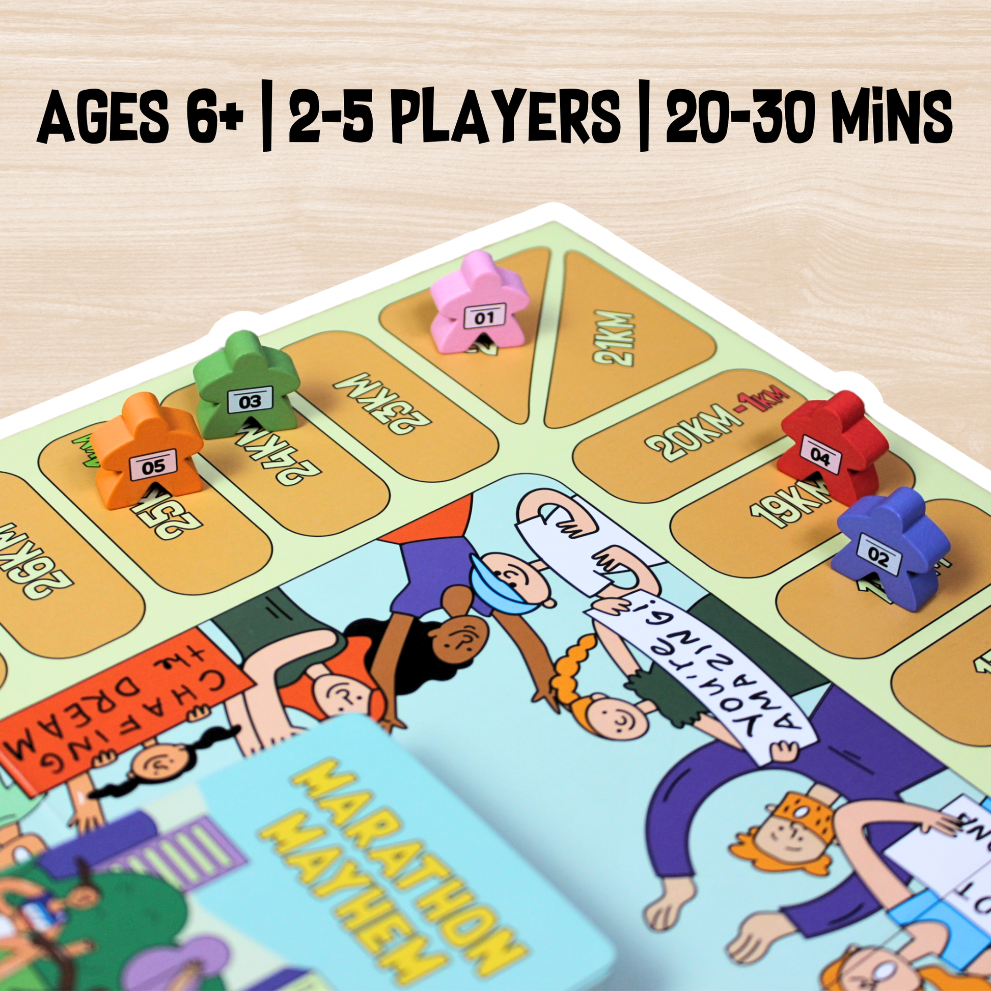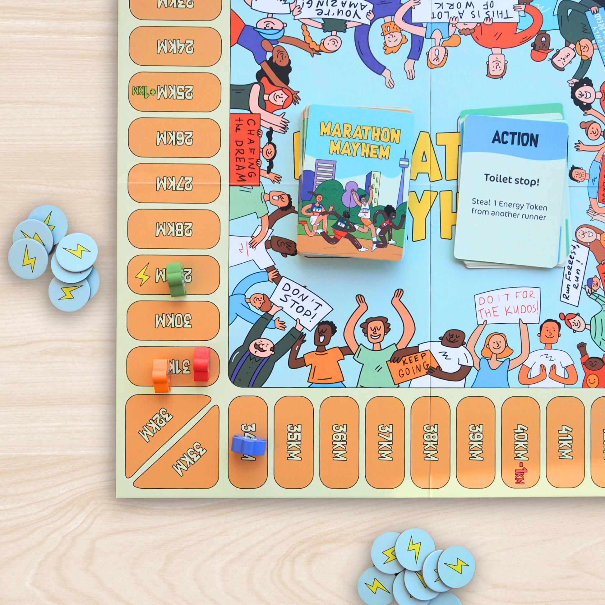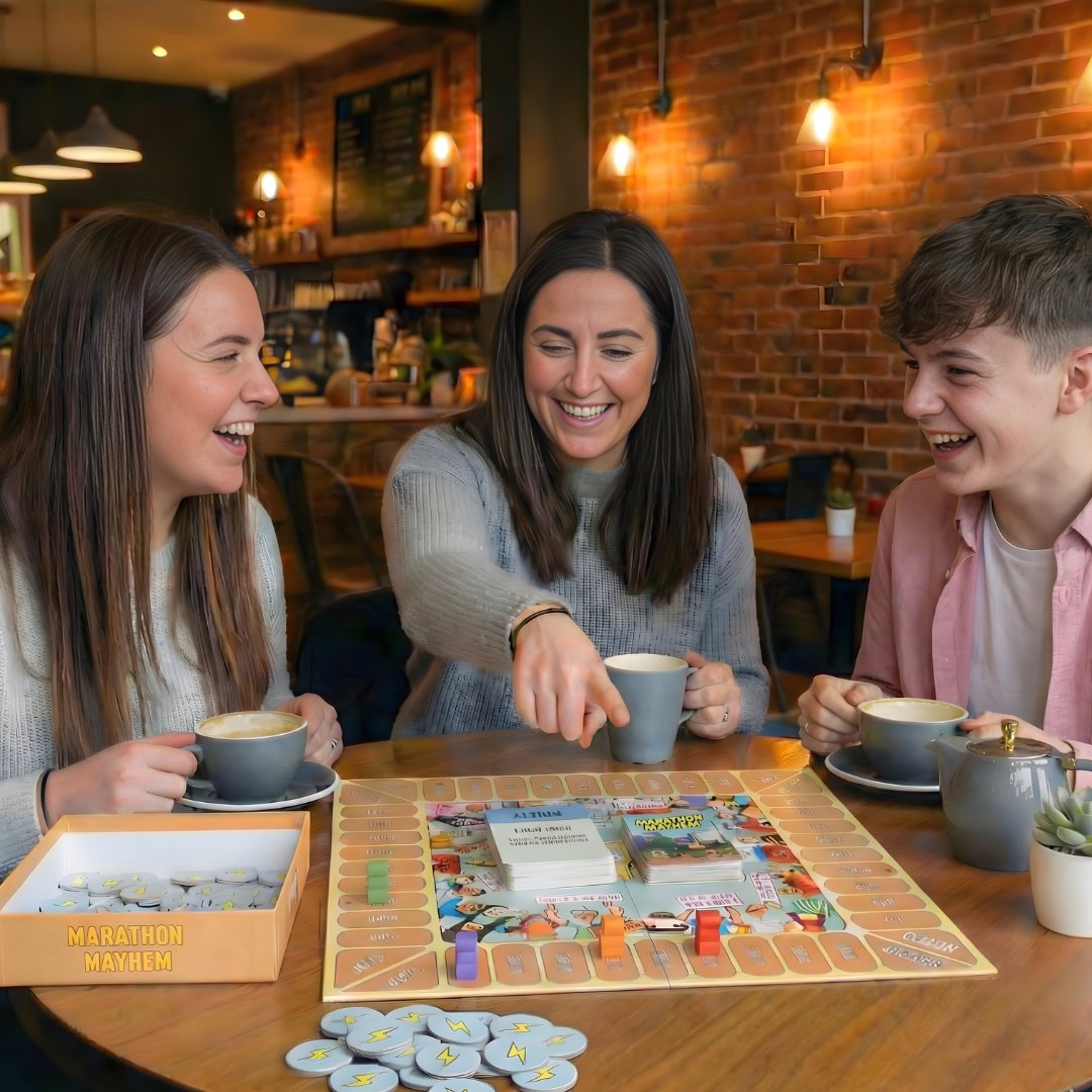 Marathon Mayhem is designed for everyone who loves to run. Whether your completing your first park run, or have a collection of marathon medals, this is the game for you! The aim of the game is to cross the finish line in first position. You must manage your energy levels efficiently while also keeping a close eye on your competition...
